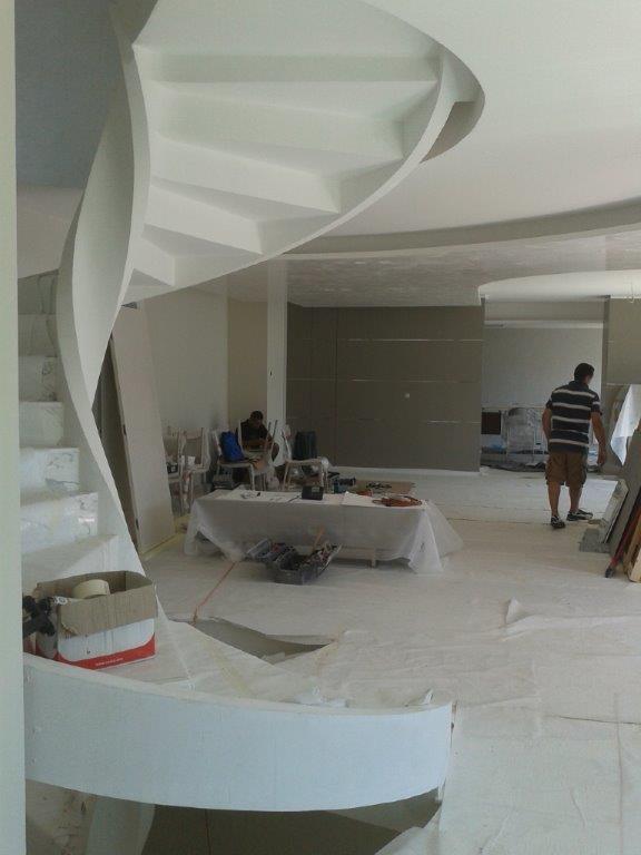 Poi, su richiesta del cliente soddisfatto delle determinanti del progetto architettonico, ci siamo presi carico anche delle finiture interne, con la scelta dei materiali per pavimenti e rivestimenti di interni ed esterni, con l'applicazione di finiture particolari in grassello di calce per soffitti e pareti, e con la distribuzione dei punti luce per uno studio scenografico dell'illuminazione sia per la zona giorno che per la zona notte.