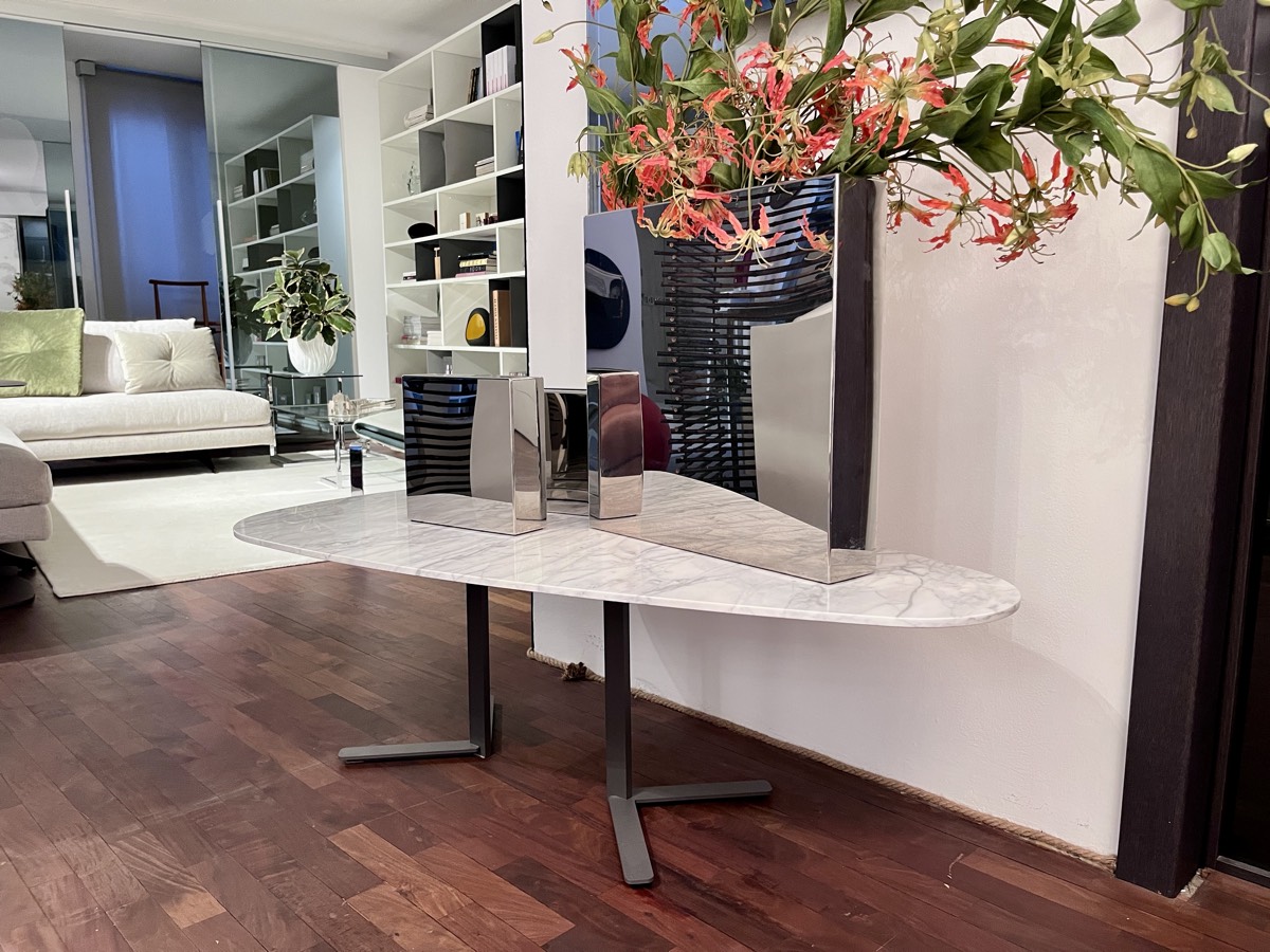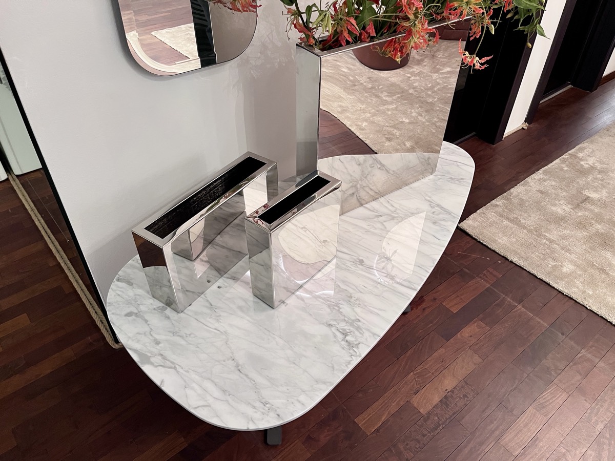 | Colori e materiali | Base in acciaio verniciato goffrato grafite, top in marmo bianco di carrara. |